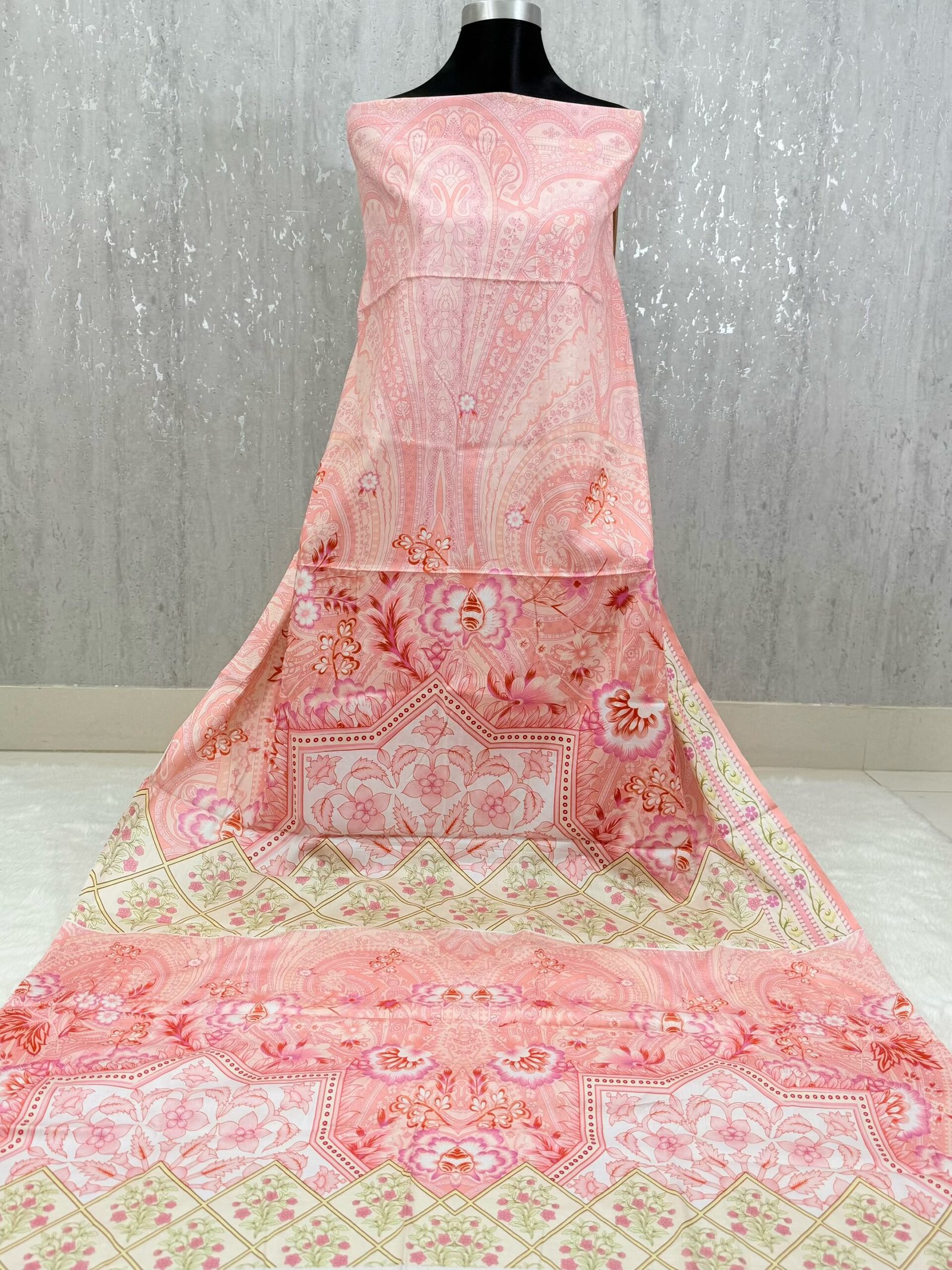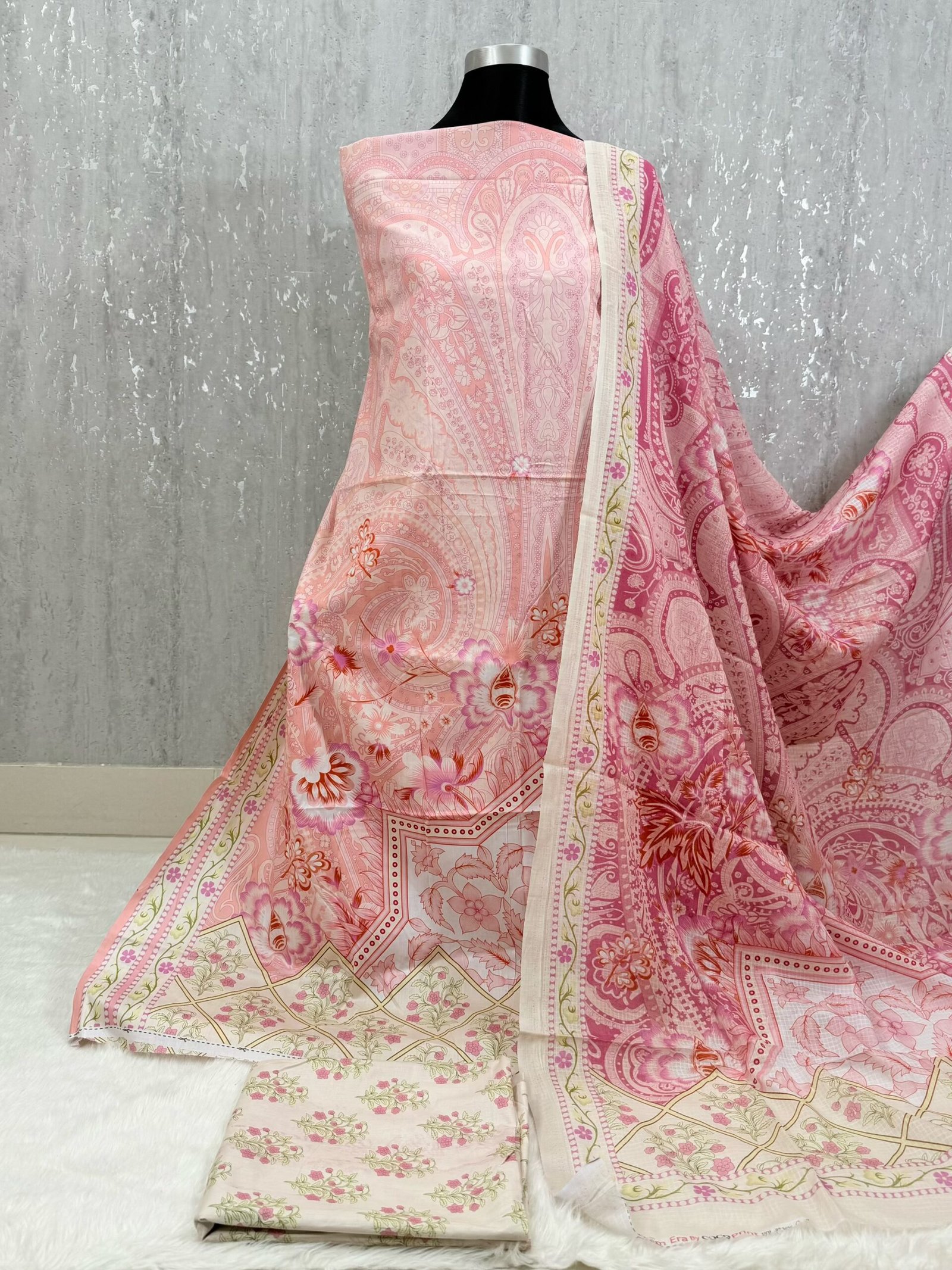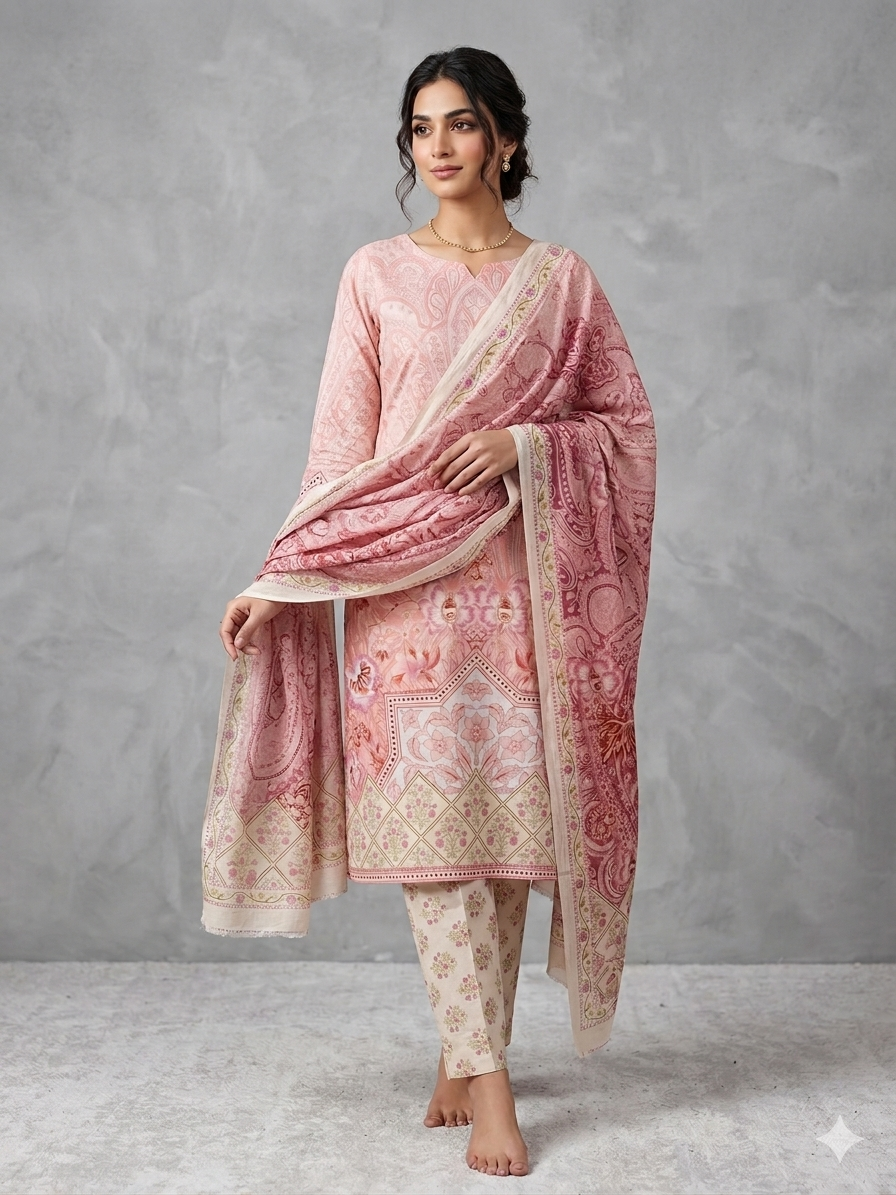 A beautifully designed unstitched 3 piece in a soft blush pink tone, perfect for an elegant everyday look. The set features a beautifully printed shirt, a coordinated dupatta, and a matching trouser for a complete and graceful outfit.